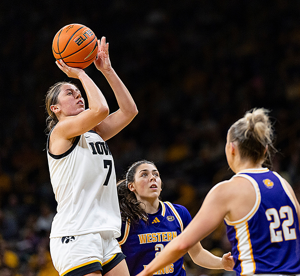 AP PHOTO BY NICK ROHLMAN/THE GAZETTE – Iowa guard Addison Deal (7) shoots over a pair of Western Illinois defenders during a college basketball game in Iowa City, Iowa on Wednesday, Nov. 26, 2025.