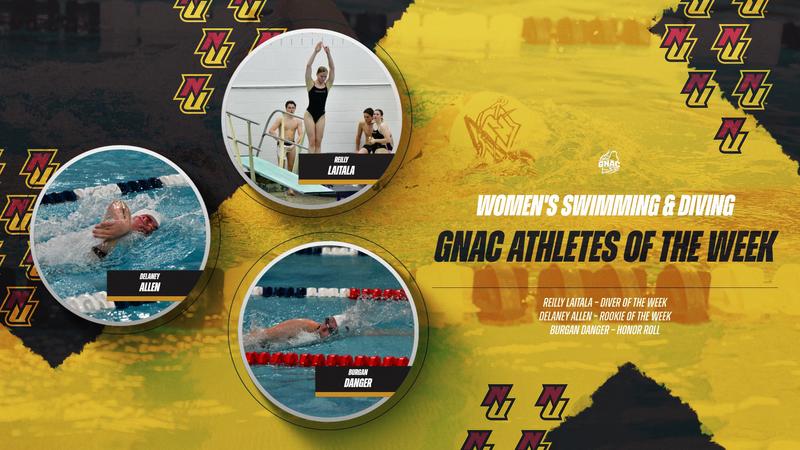 WINTHROP, Mass. – The Norwich University women’s swimming and diving team received notable recognition from the Great Northeast Athletic Conference (GNAC) this week. Senior Reilly Laitala (Sterling, Mass.) was honored as the GNAC Diver of the Week for the fifth time this season, marking the 16th instance in her illustrious career. Additionally, freshman Delaney Allen (Gibsonia, Pa.) earned the title of GNAC Rookie of the Week for the second time this season, while her teammate, freshman Burgan Danger (Wadsworth, Ohio), was named to the GNAC Weekly Honor Roll.