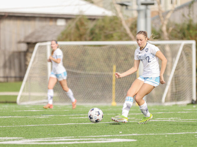 Photo by Iowa Central Athletics: McKenna Hilton of Iowa Central works the ball up the field on Saturday against Central.
