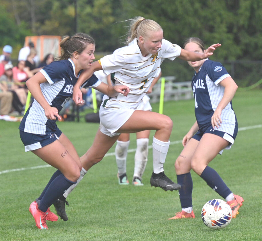 Hannah Kastamo of Northern Michigan University competes for the ball against Cedarville’s Savannah McConnell and Evania McCandless during a recent match. (Photo courtesy Cara Kamps)